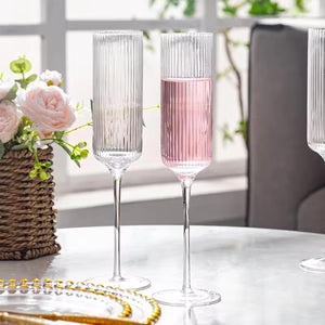 The distinctive vertical ribbing gives these glasses a chic, contemporary feel while reflecting ambient light for an exquisite look – ideal for weddings, romantic dinners, and festive celebrations. -
