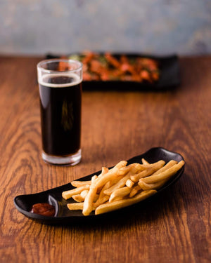 Serve your snacks in style with this modern Chip n Dip Platter. Designed with a sleek, matte-black finish and a built-in dip compartment, this platter is perfect for serving French fries, nachos, wedges, momos, pakoras, finger foods, and more. The compact yet elegant design makes it ideal for house parties, cafés, restaurants, and everyday snacking at home.