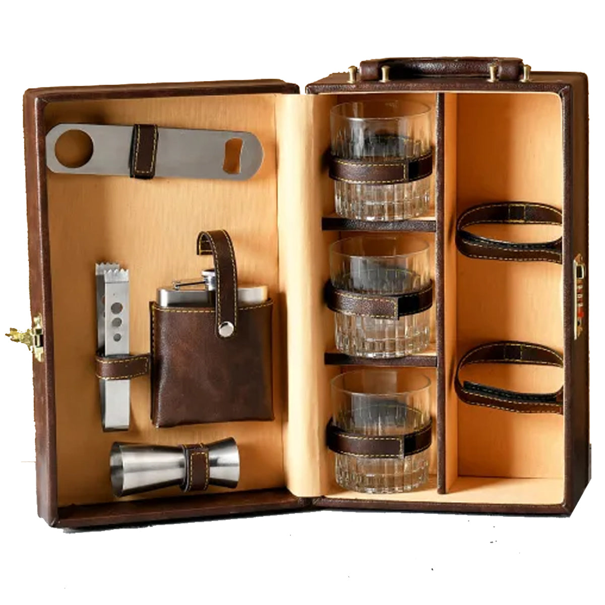 Designed with padded compartments and secure leather straps, your glassware and tools stay snug and safe. With a briefcase-style handle and metal latch lock, it’s ideal for outdoor gatherings, picnics, camping, or gifting.